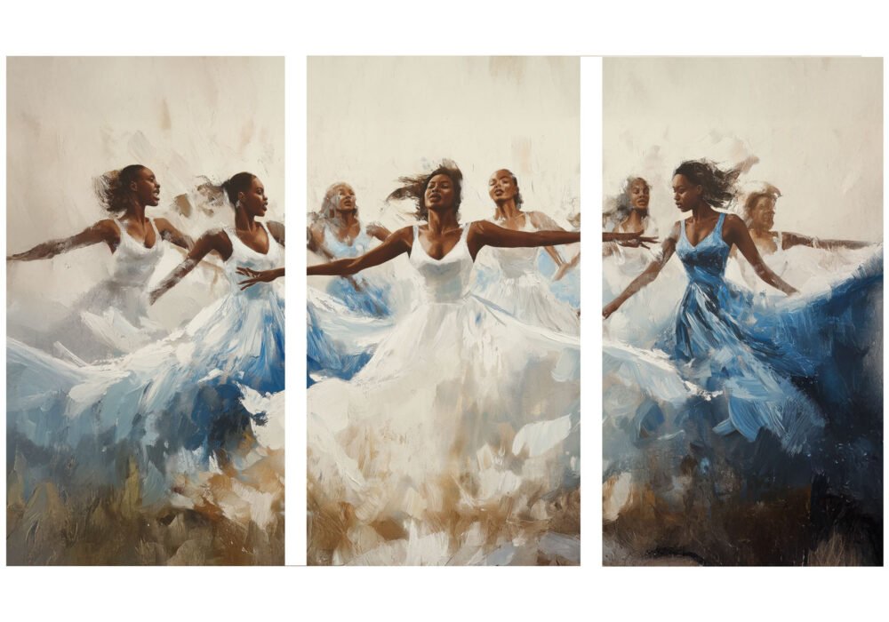 This is a triptych (three-panel) oil painting on canvas depicting a group of women...