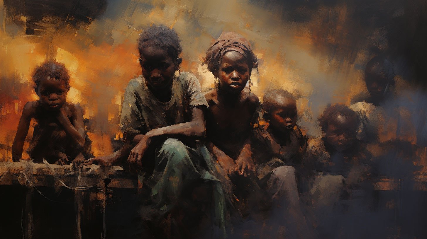 This painting captures a group of children enduring the hardships of displacement. “Left Behind” depicts children haunted by loss, shadows of a home burned, and memories faded. Amidst darkness and chaos, their solemn faces embody the pain of displacement, longing for a place they no longer know, highlighting the silent suffering of countless migrants on their arduous journey.