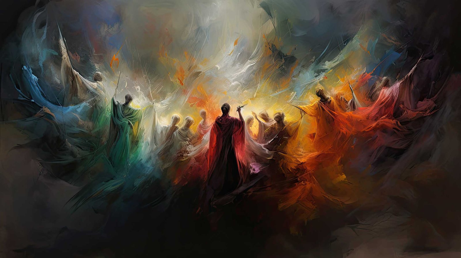 Titled “Symphony of Hope,” this vibrant artwork depicts a group of luminous figures harmoniously intertwined in a celestial dance, symbolizing collective optimism. The swirling movement and layered textures create a dynamic sense of energy, capturing the uplifting power of a symphony that elevates the human spirit.