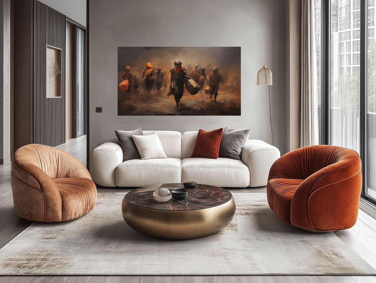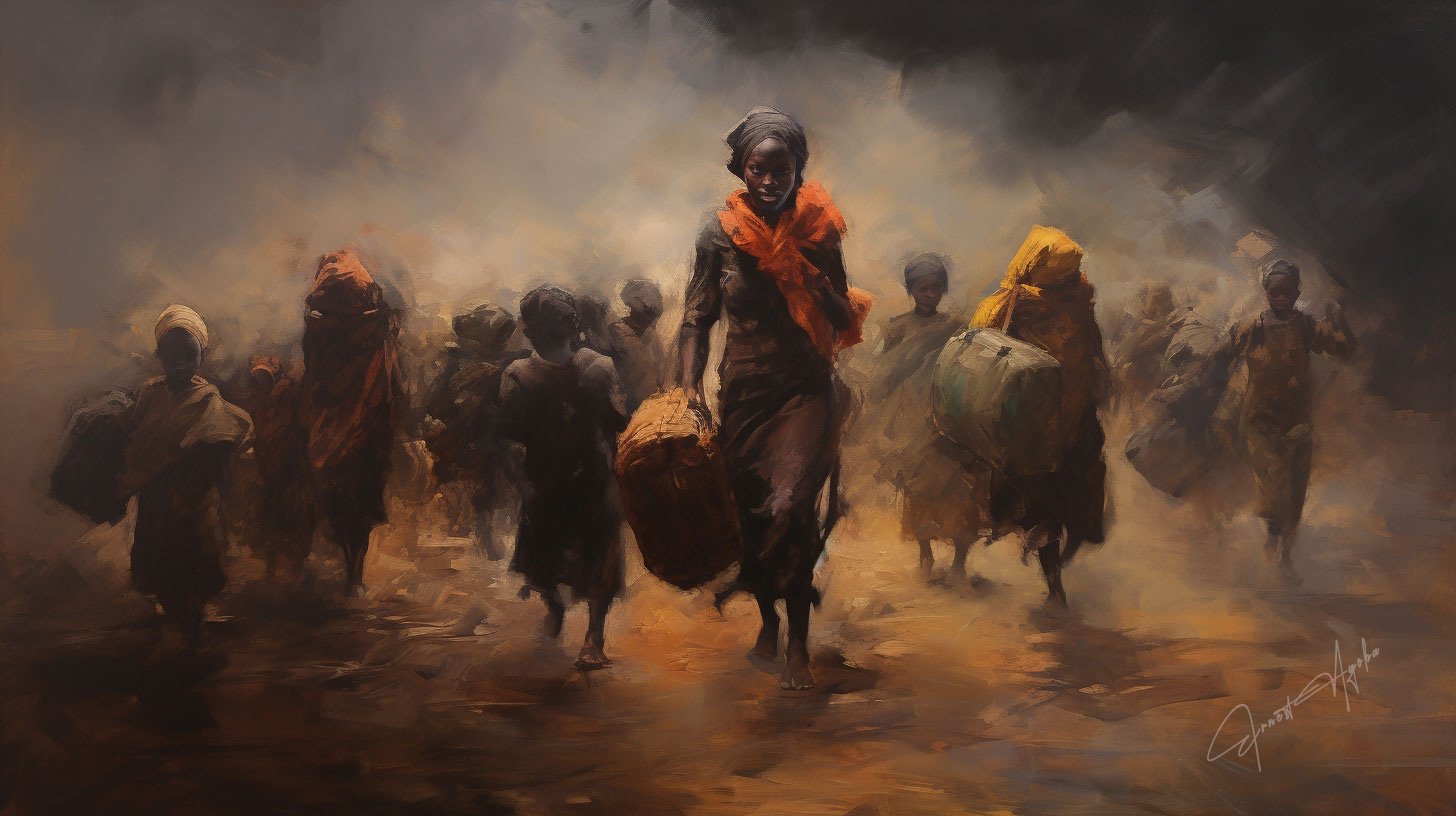In my art series “A Long Journey from Home,” I explore the profound human experience of migration through a unique blend of realism and abstract symbolism that illustrates the travails associated with the search for new dreams and comfort. I capture the tension between hope and despair that defines the migrants’ journeys. My technique often juxtaposes detailed figures against swirling, chaotic backgrounds to reflect the turbulence of leaving one’s homeland. This artwork, “The Dusty Roads” portrays people navigating a hazy landscape in pursuit of new dreams. The figures symbolize the collective struggle and resilience of migrants, each bearing his or her burdens. The muted color palette enhances the emotional gravity of their journey, capturing the tension between hope and adversity as they seek new lives amid uncertainty. Through my art, I emphasize the sacrifices made in pursuit of a new future. Each piece serves as a canvas for these narratives, illuminating our shared humanity amid adversity. This work illustrates the courage required to pursue dreams, even when the path is filled with uncertainty. Other artworks in this series are Lighted Horizon, Immigrant Child, and Light and the Tunnel